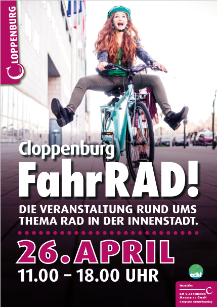 Ganz im Zeichen des Fahrrades steht Cloppenburg am Sonntag, 26. April 2026, wenn es von 11 bis 18 Uhr wieder heißt „Cloppenburg FahrRAD“. Die örtlichen Fahrradhändler präsentieren in der Innenstadt das Neueste vom Zweirad-Markt